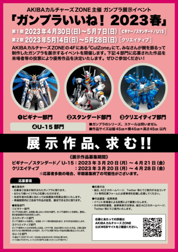 AKIBAカルチャーズZONE(ACZ)主催のガンプラ展示イベントを開催いたします。ご応募いただいた作品をAKIBAカルチャーズZONE 4階CulZoneにイベント期間中展示し、イベント来場者等の投票により優秀作品を決定いたします。